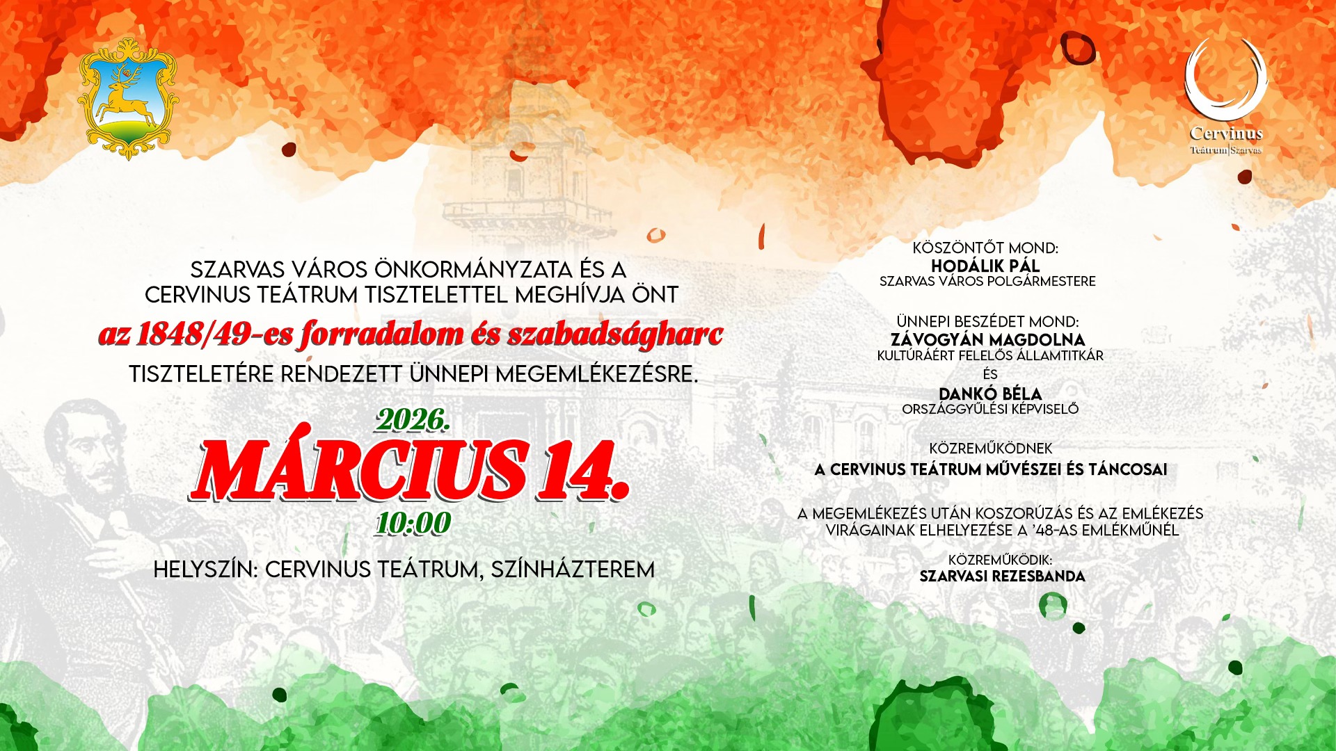 Szarvas Város Önkormányzata és a Cervinus Teátrum tisztelettel meghívja Önt az 1848/49-es forradalom és szabadságharc hőseinek emlékére rendezett ünnepi megemlékezésre.